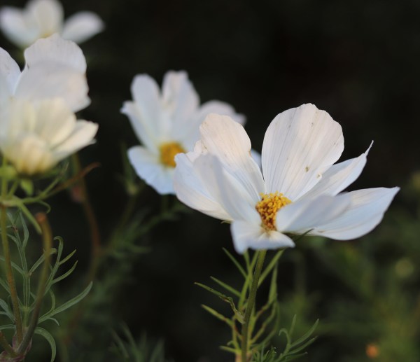 Beautiful white cosmos flowers in early morning sunlight